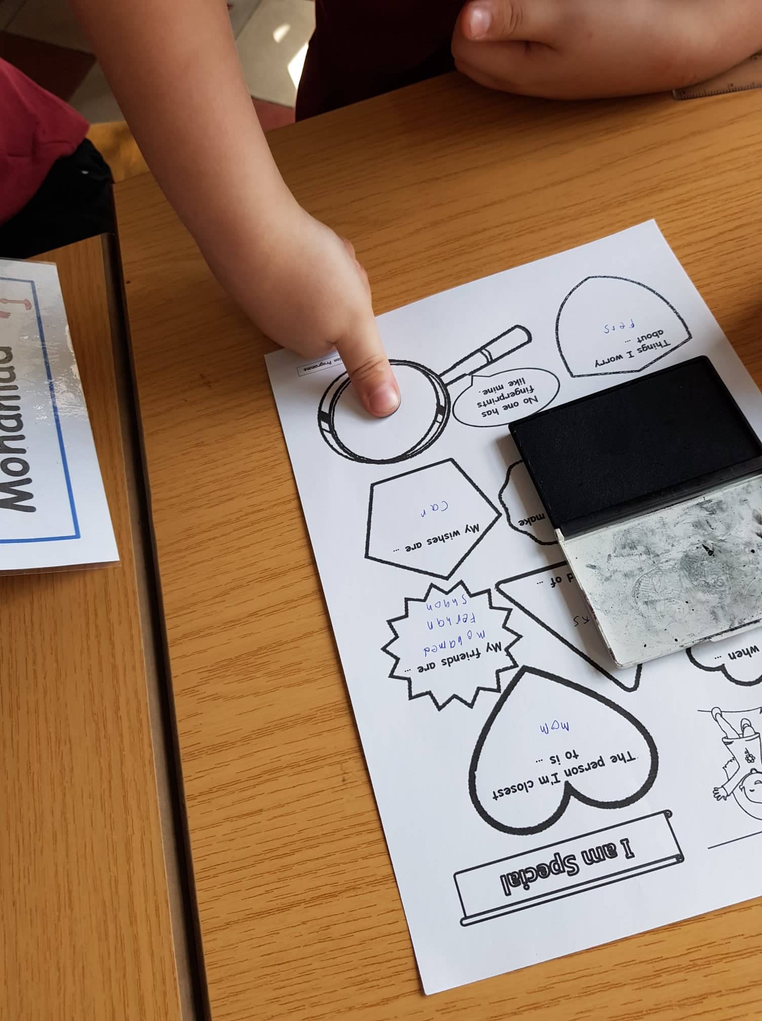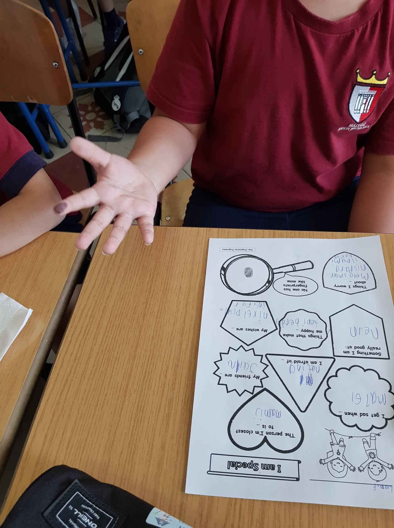 At the end of this lesson, we filled the handout: “I am Special”. We wrote about our wishes, worries, fears, things that make us happy and others. Then we used the ink pad to print our fingerprint.
