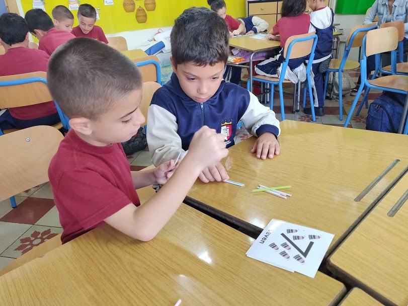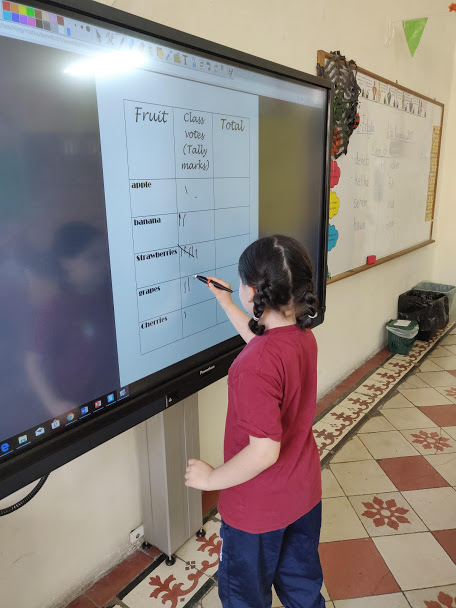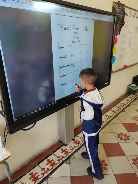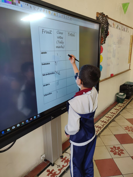 Our teacher told us to vote for our favourite fruit from a list of different fruits. We all voted for our favourite one and we learned that our voting was recorded using tally marks. The teacher then asked us to work in pairs and use straws to display tallies that match the given number card.